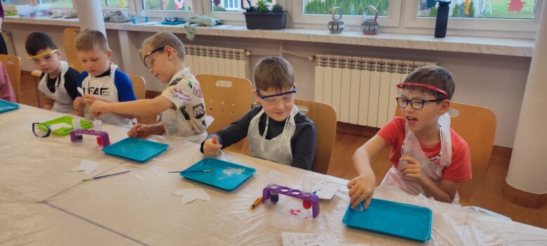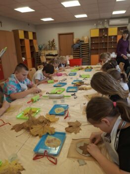🔴Kolejne warsztaty poświęcone były zjawisku chromatografii na których dzieciaki eksperymentowały z kolorami. Studenci dowiedzieli się dlaczego liście zmieniają kolor oraz wykorzystali je do pracy z gliną.