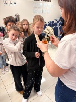 Na te i wiele innych pytań odpowiedzieli p. Roman i Iwona Staniszewscy, którzy wprowadzili Studentów w fascynujący świat pszczół. Można było obejrzeć ul od środka i zobaczyć z jakich części się składa, przymierzyć strój pszczelarza czy też posmakować pysznego miodu 🥰